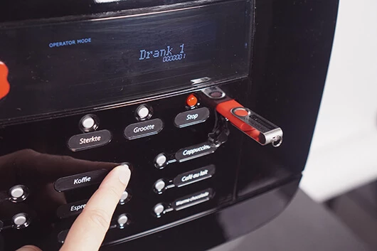 Steek de meegeleverde Cafitesse Operator Key (de USB-stick) in jouw Cafitesse Excellence Compact. Hierdoor start de operator modus automatisch. Je ziet in het display nu ‘tellerstanden’ staan.