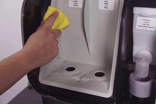 When your coffee machine was delivered, you received a rag to clean the ingredient guides. These are the holes that hold the ingredient dosing spouts. You can move the rag up and down completely through the spout.