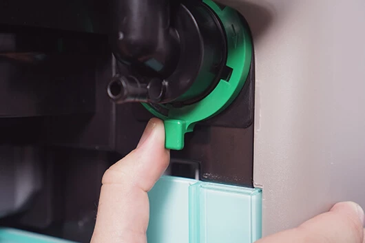 On the right-hand side of your coffee machine, the dispensing hose is attached to the mixing bowl. Twist it back and forth until it comes loose.