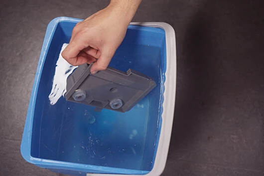 Place the entire mixing container in hot water along with Suma Café Tabs. Soak the mixing bowl for about 15 minutes. Then rinse the mixing bowl thoroughly and dry it with a clean, dry cloth.