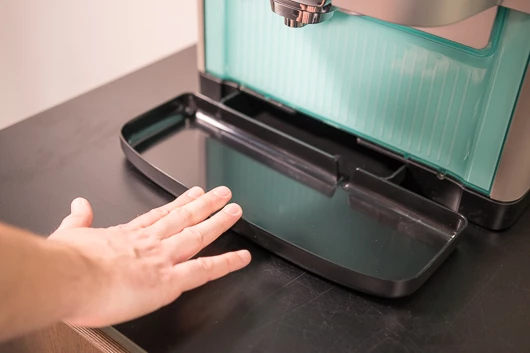 Skyv dryppbrettet tilbake i kaffemaskinen. Pass på at du trykker det ordentlig ned.
