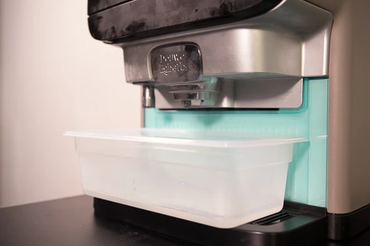 Skjermen viser nå "Plasser oppsamlingsbeholder". Du må plassere det medfølgende oppsamlingsbrettet under tutene. Hvis du ikke har det tilgjengelig, kan du bruke en beholder med minst 1 liter kapasitet.