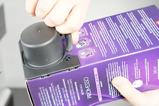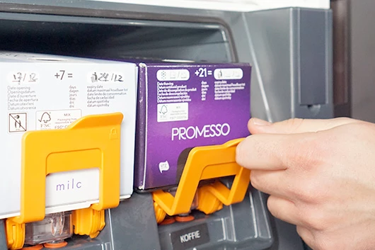 Promesso-maskinen din vil indikere når det er på tide å bytte ut ingredienspakkene. Prosedyren er den samme for melk og kaffe.